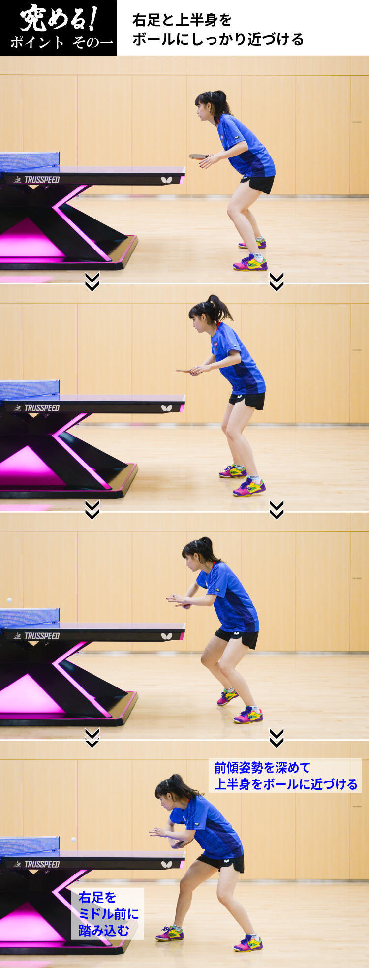 このケースで体をボールに近づけるときは、レシーブを構えた位置から右足をミドル前(斜め前)に踏み込むことが基本になりますが、このとき、右足だけでなく、上半身もボールに近づけることを心掛けてください。せっかく右足を踏み込んでも、上半身が起き上がってボールから離れてしまうと、思うようにスイングできません。