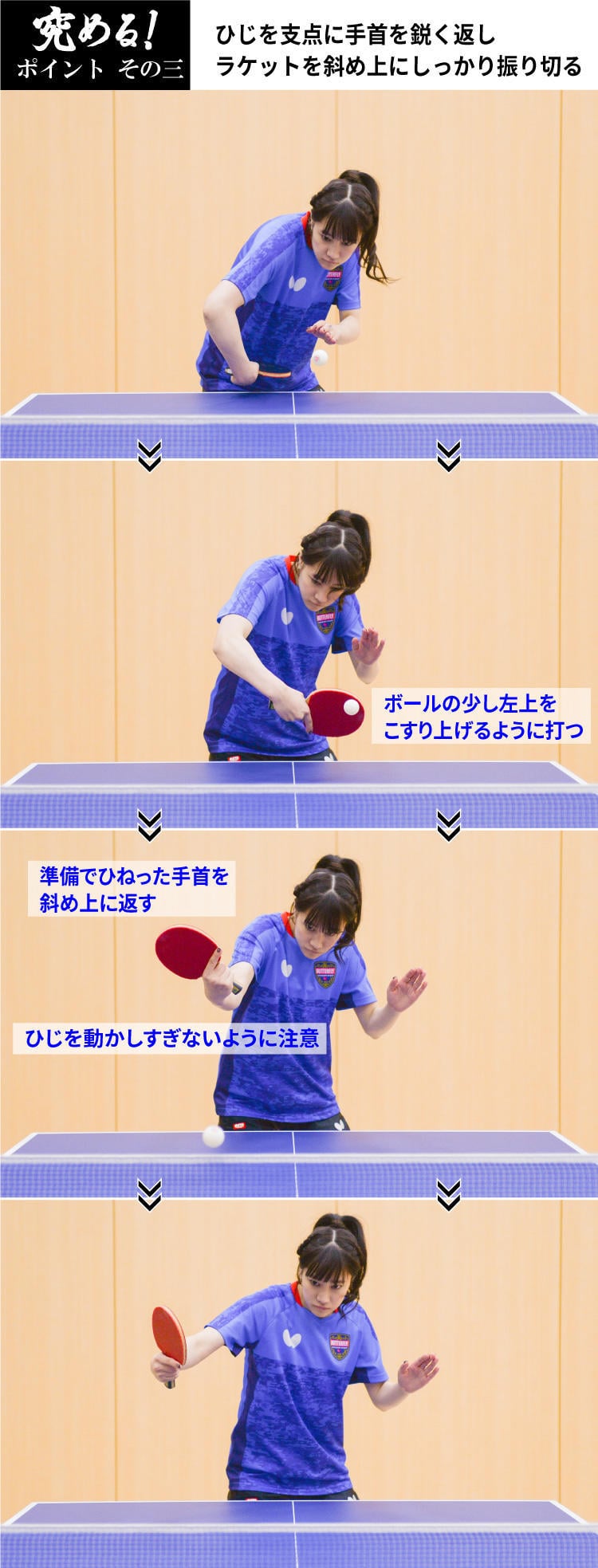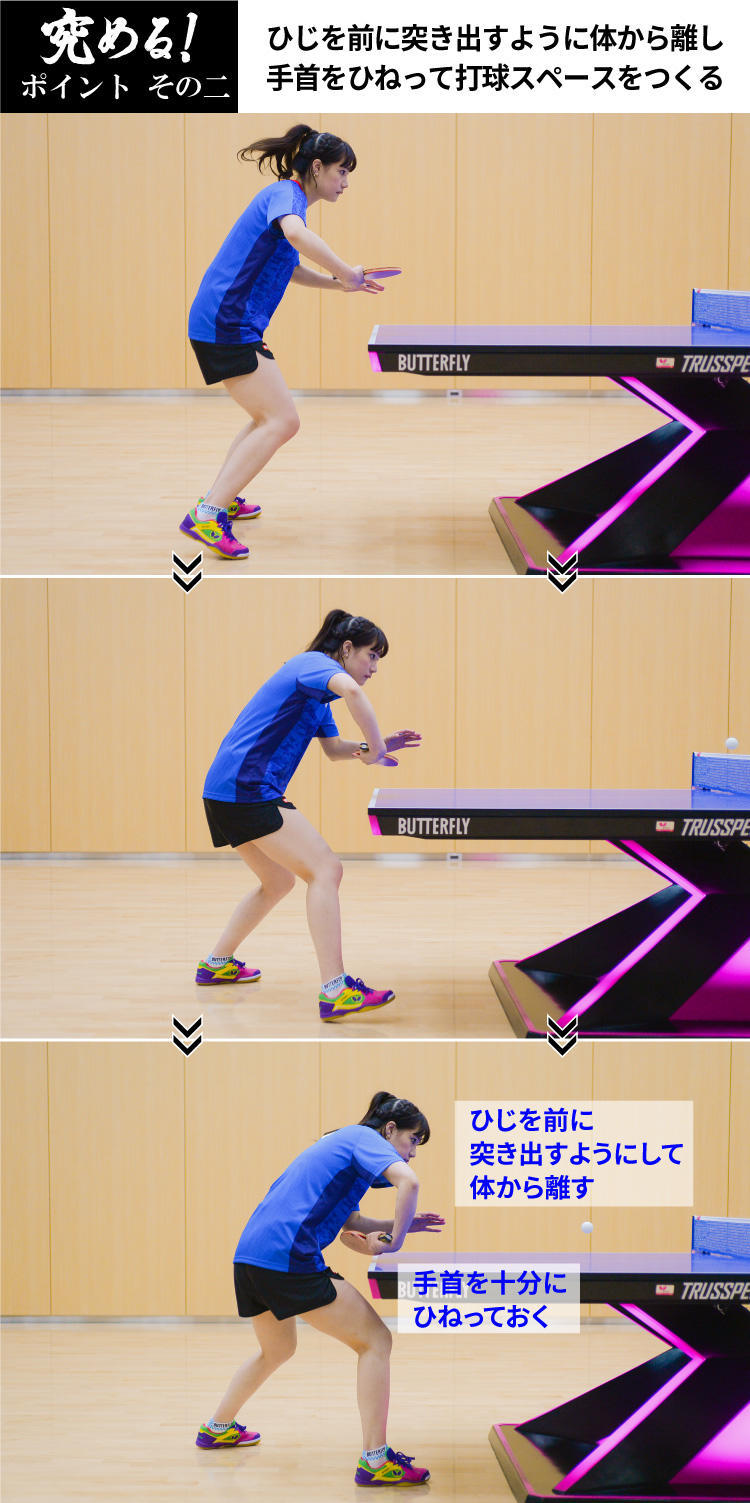 今回は、ミドル(センターライン付近)前に来た横下回転サービスに対してチキータするときを例に挙げて、浜本選手がポイントを解説してくれる。女子トップクラスのチキータの精度を誇る浜本選手が話すポイントは、女子選手はもちろんのこと、男子選手にとっても大いに参考になるだろう。