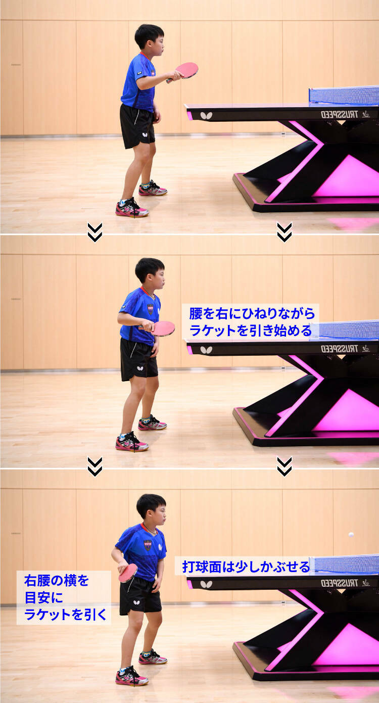 ラケットを胸の高さあたりに構えたら、ラケットを右腰の横あたりに引いてバックスイングします。注意点は、腕だけを引こうとしないこと。腕だけでラケットを引くのではなく、腰を右に小さくひねる動作を使って体の回転を意識しながらラケットを引きましょう。