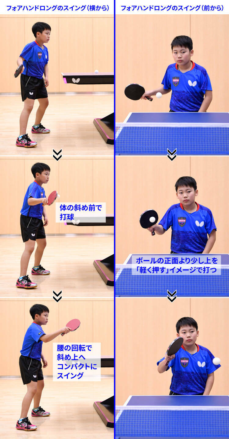 フォアハンドの基本打法は、「フォアハンドロング」です。フォアハンドロングは、通称「フォア打ち」とも呼びます。フォアハンドロングの体の使い方やラケットの動かし方は、試合で使ういろいろなフォアハンド技術のもとになります。