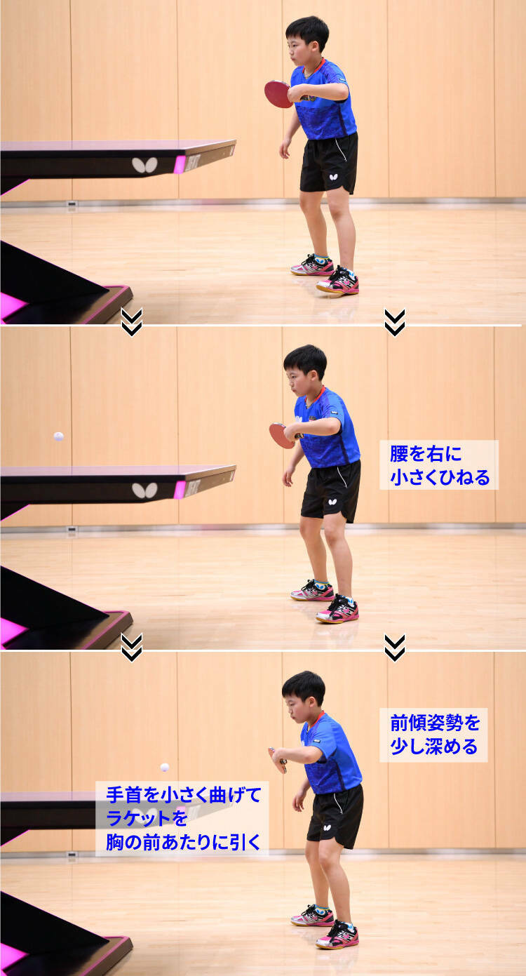 ラケットを胸のあたりに小さく引くときは、手首をほんの少し自分の方へ曲げます。ただし、手首を大きく曲げてしまうと、打球するときのラケットの面が不安定になってコントロールが難しくなるので、手首の曲げすぎに注意してください。●前傾姿勢をほんの少し深める