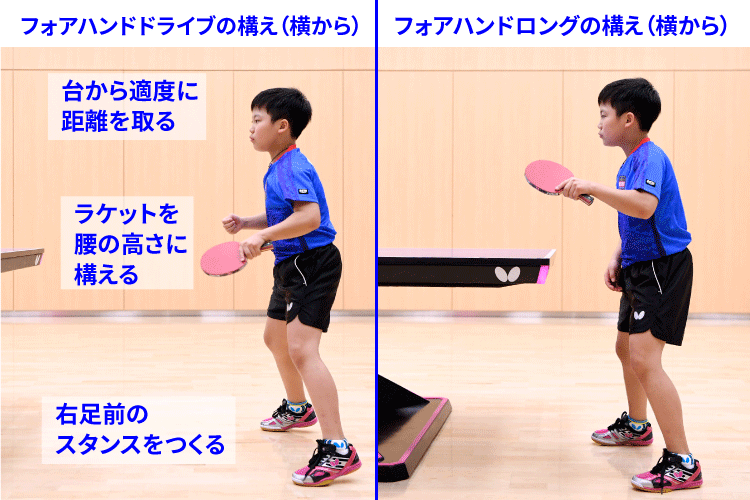 フォアハンドドライブは、フォアハンドロングに比べてスイングが大きくなります。そのため、フォアハンドドライブで打球するときは、フォアハンドロングに比べて台から少し距離を取って構え、スイングするための空間をつくりましょう。