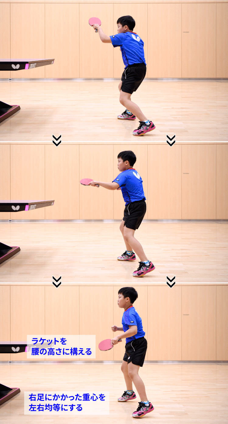 フォアハンドロングの時と同じく、スタンス(足の構え)は右足を左足よりも少し前にします。このスタンスをつくると、腰を右にひねりやすく、スムーズにバックスイングができます。また、棒立ちにならないように、両足のひざを軽く曲げ、上体を少し前傾させましょう。●ラケットを腰の高さに構える