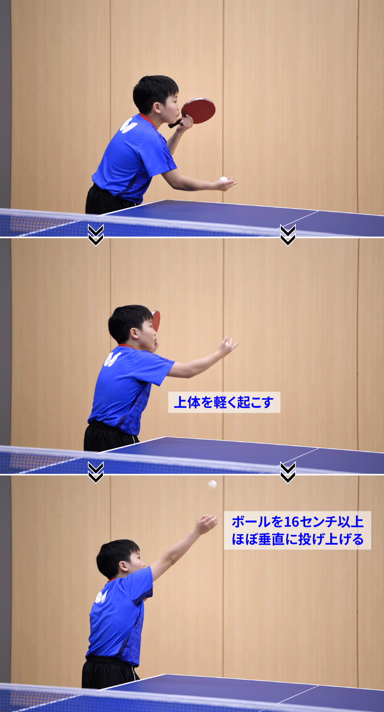 サービスを出す動作は、手のひらを開いてボールを乗せ、静止させたところから開始します。ここから、ボールを16cm以上ほぼ垂直に投げ上げ、落下してくる途中を打ちます。そして、自分のコートにワンバウンドさせてから相手コートに入れましょう。