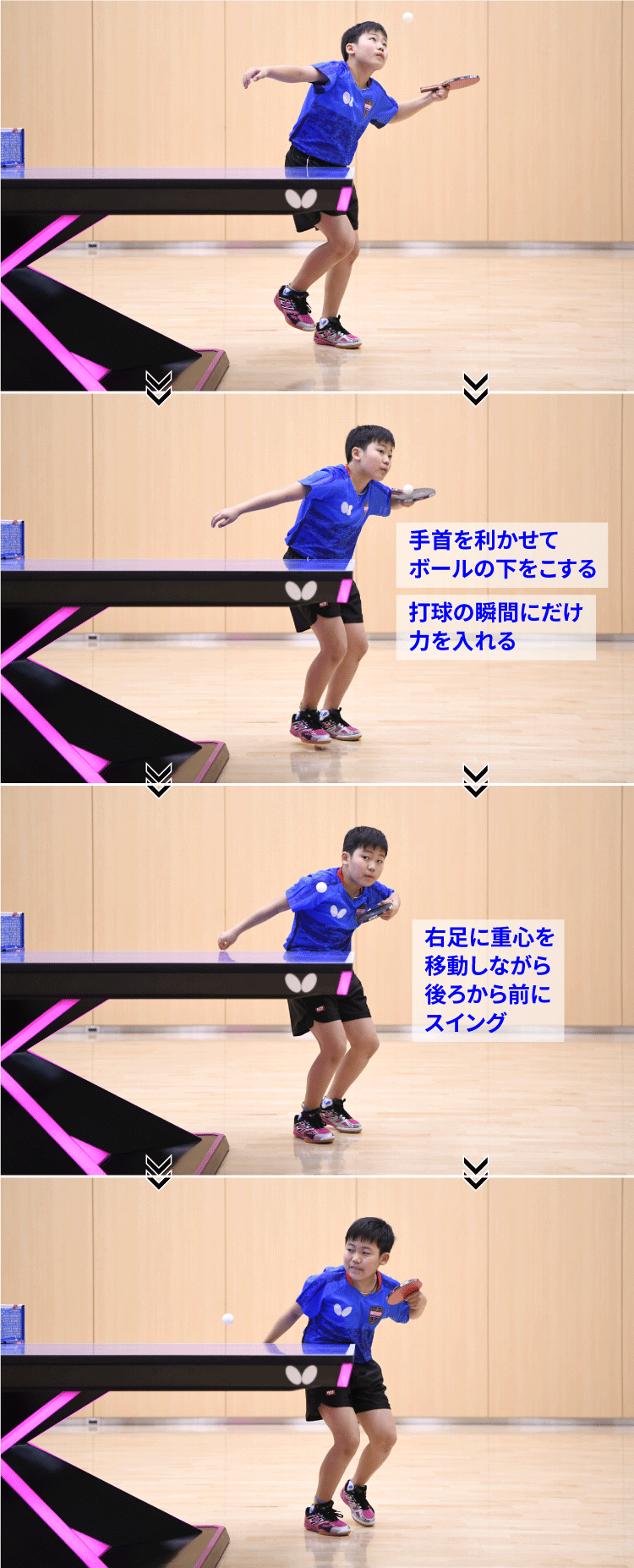 ボールに下回転をかける感覚は、空振りのすぐ近くにあります。空振りを怖がらず、面を上に向けたスイングでボールの下をこすることを根気よく繰り返し、ボールに下回転をかける感覚をつかんでください。