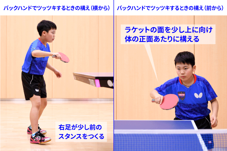 バック側に短く来た下回転のボールに対してバックハンドでツッツキするときは、右足が左足よりも少し前のスタンス(足の構え)にします。このスタンスで構えると、短いボールに体を近づけやすくなります。●面を少し上に向けて構える