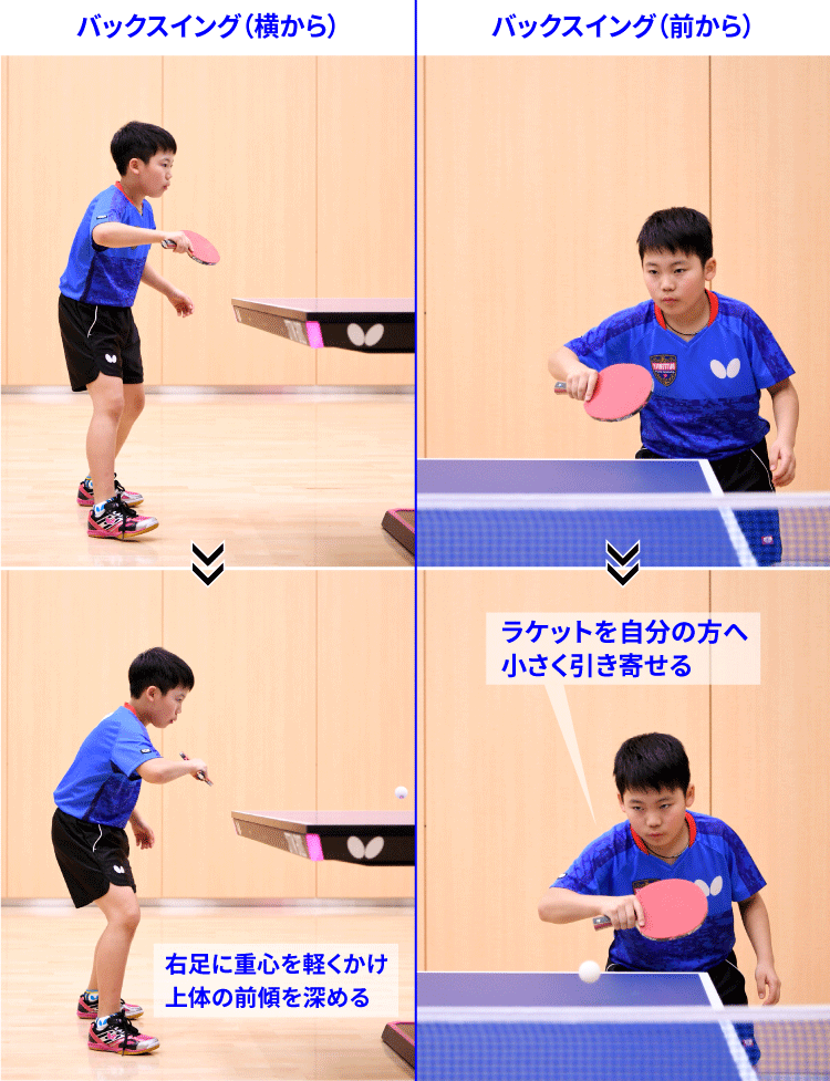 面を少し上向きにし、ラケットを体の正面近くに構えたら、ひじを前に少し出しながらラケットを自分の方へ小さく引き寄せるようにバックスイングします。上向きの面を変えないよう注意してバックスイングしましょう。