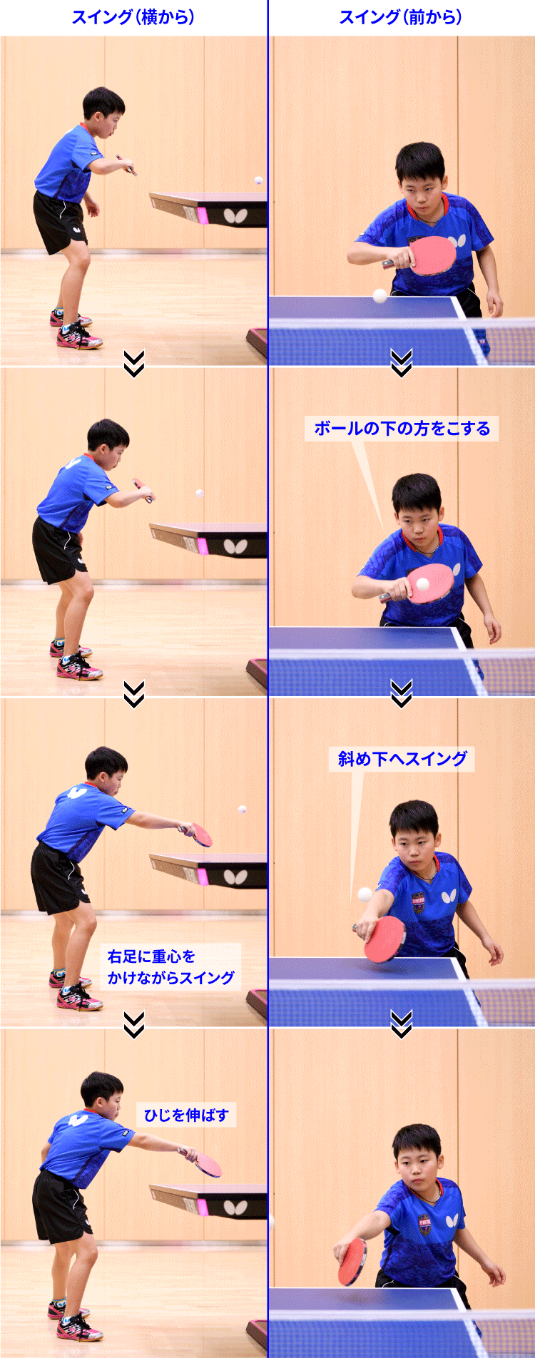 今回紹介する「ツッツキ」は、ボールに下回転をかける技術で、主に台上に短く来た下回転のボールに対して使います。ツッツキは「相手の下回転のボールを安定して返しやすい」というメリットがり、試合で使うことがとても多い技術です。