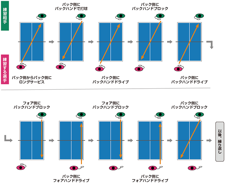 バック側2本→フォア側2本の順に送られる練習相手のロングボール(ブロック)に対し、バック側に来たロングボールに対してはバックハンドドライブ、フォア側に来たロングボールに対してはフォアハンドドライブにそれぞれ切り替えて打球する。