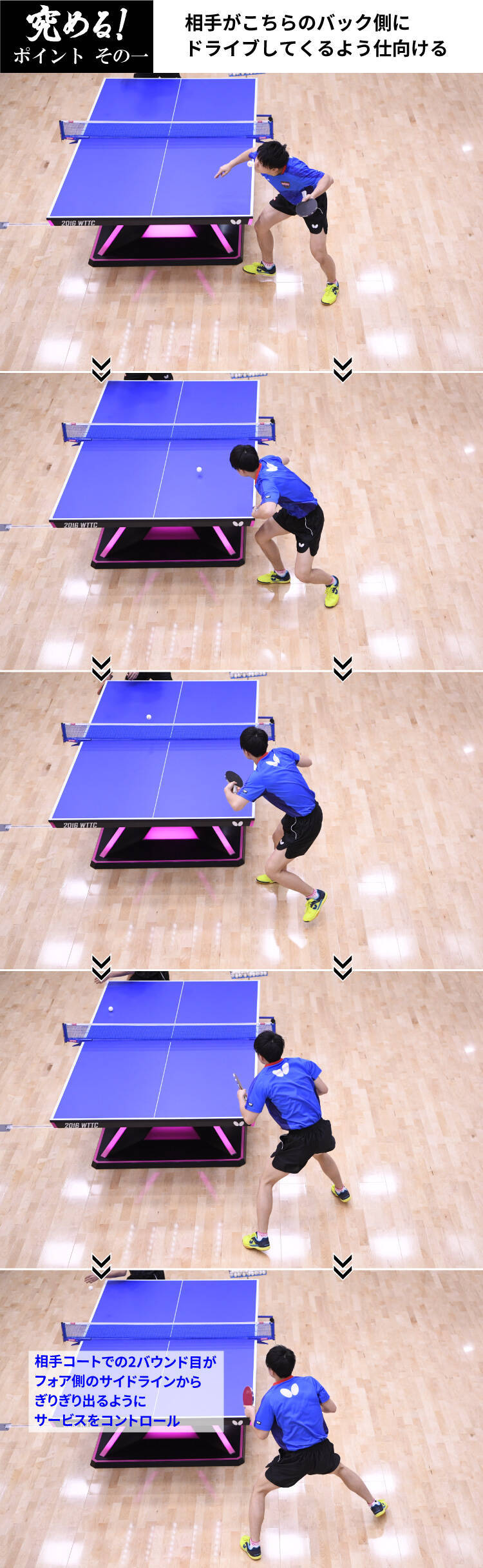 このパターンを使うときは「サービスを出したら相手の打球を待たずにバック側に回り込む」ことが大きなポイントです。