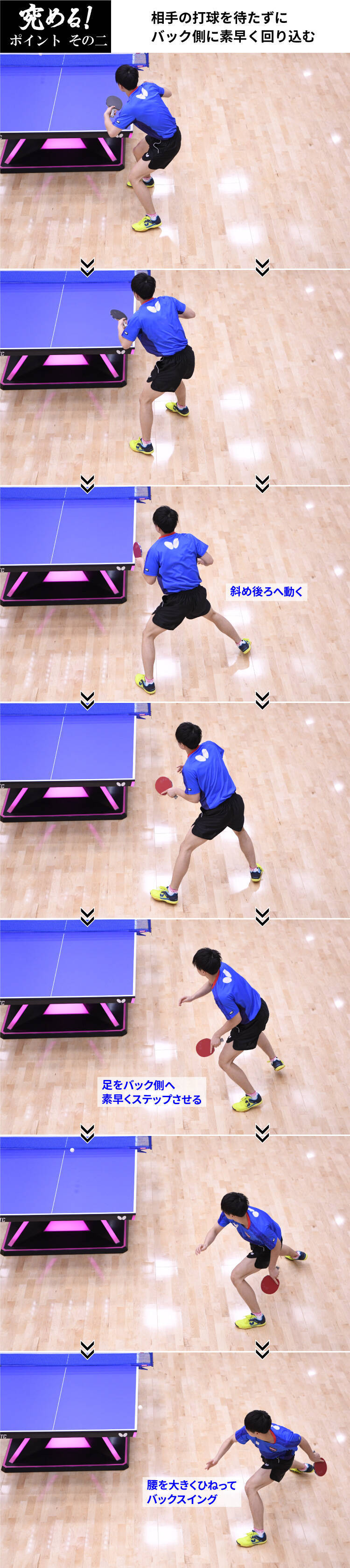 バック側にドライブが来た場合、バックハンドでブロックする方法が一般的だが、ブロックに加え、回り込んでフォアハンドでカウンタードライブできると、得点力が増す上に、相手に大きなプレッシャーを与えることができる。