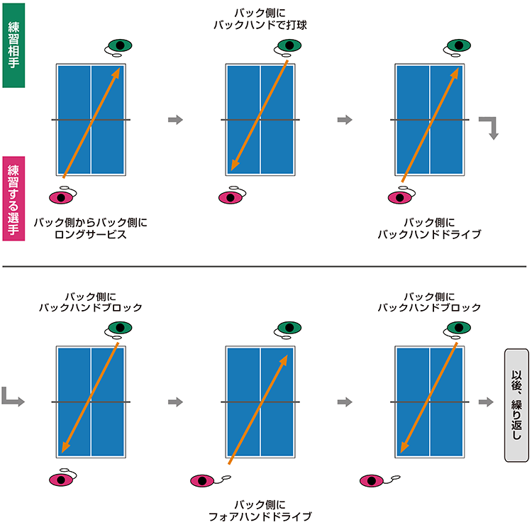 バック側に送られる練習相手のロングボール(ブロック)に対し、バックハンドドライブで1本打球したら、バック側に回り込みんでフォアハンドドライブで1本打球するパターンを繰り返す。
