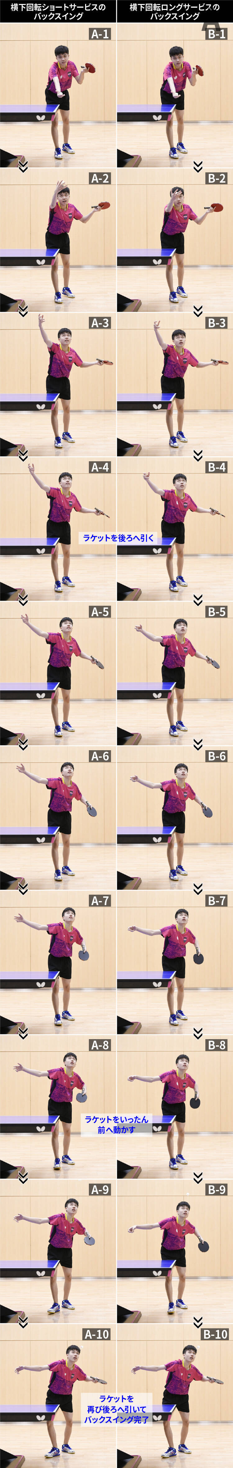 続いて、林昀儒の横下回転ショートサービス(連続写真A-1~10)と横下回転ロングサービス(連続写真B-1~10)を例に挙げて、バックスイングでのラケットの動きを見ていこう。独特な動きなので、よく注目してほしい。