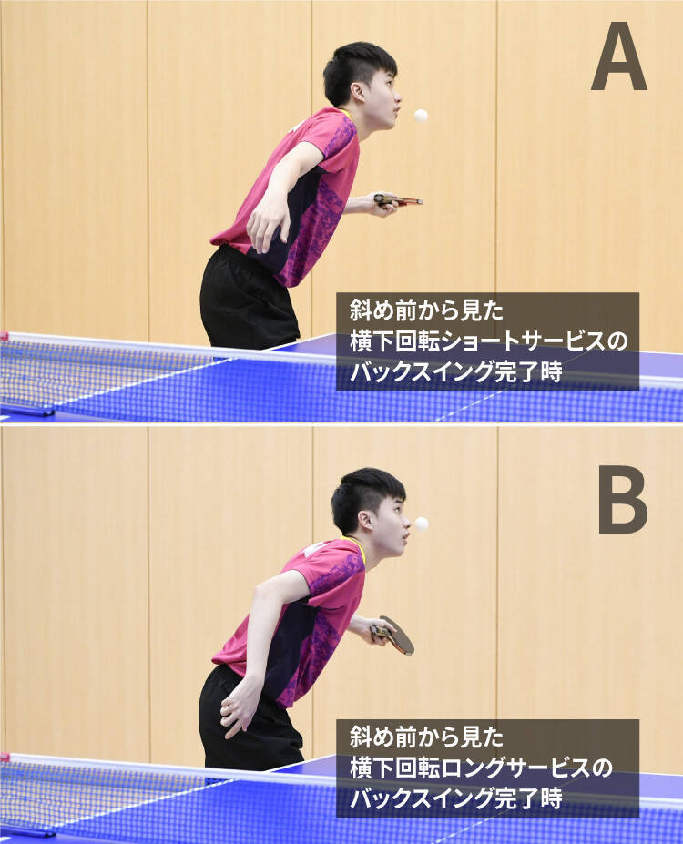 特に注目すべきは、横下回転ロングサービスのバックスイング(写真B)。一般に、ロングサービスを出す時はより強い力で打球しようとバックスイングが大きくなりやすいものだが、林昀儒のバックスイングは横下回転ショートサービスとほとんど変わらない。レシーバーからすると、このバックスイングからあの鋭いロングサービスが来るとは想像することが難しいだろう。