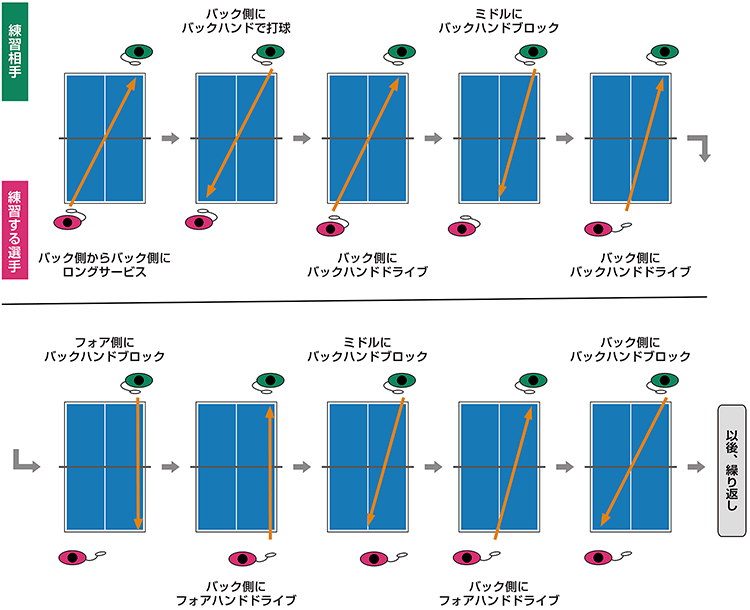 バック側→ミドル→フォア側→ミドル→バック側の順に送られる練習相手のロングボール(ブロック)に対し、バック側に来たロングボールに対してはバックハンドドライブで打球し、ミドルとフォア側に来たロングボールはフォアハンドドライブで打球する。