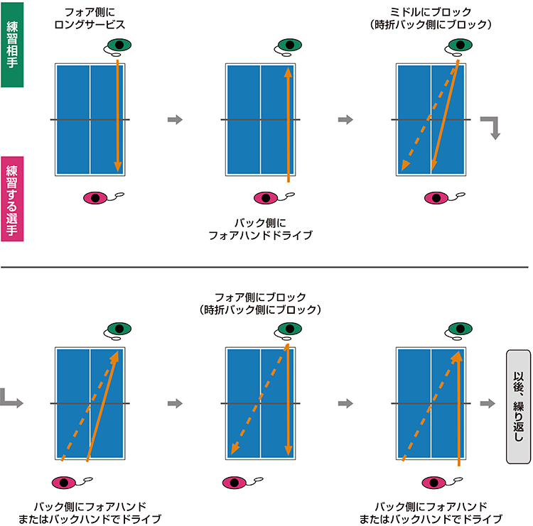 練習する選手は、フォア側とミドルに来たボールはフォアハンドドライブで打球し、バック側に来たボールはバックハンドドライブで打球する。