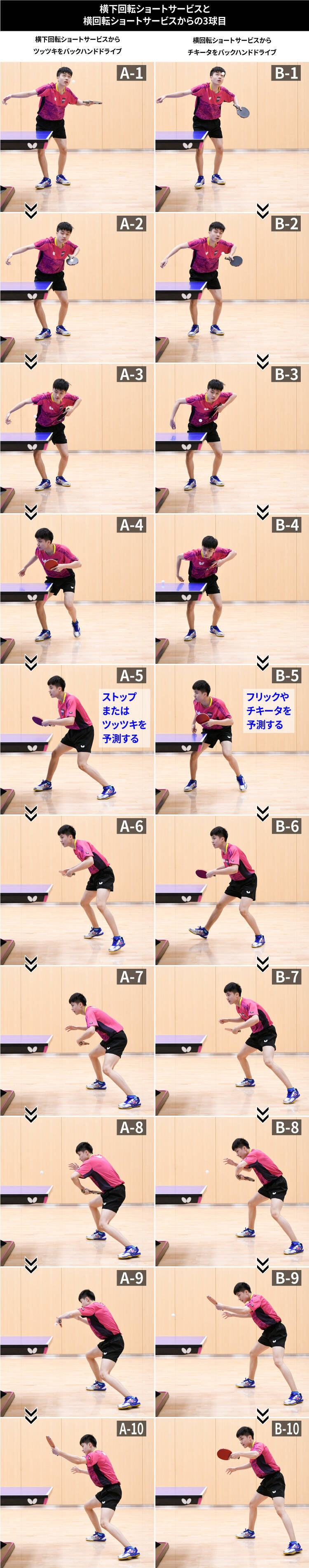 横下回転ショートサービスと横回転ショートサービスからの3球目