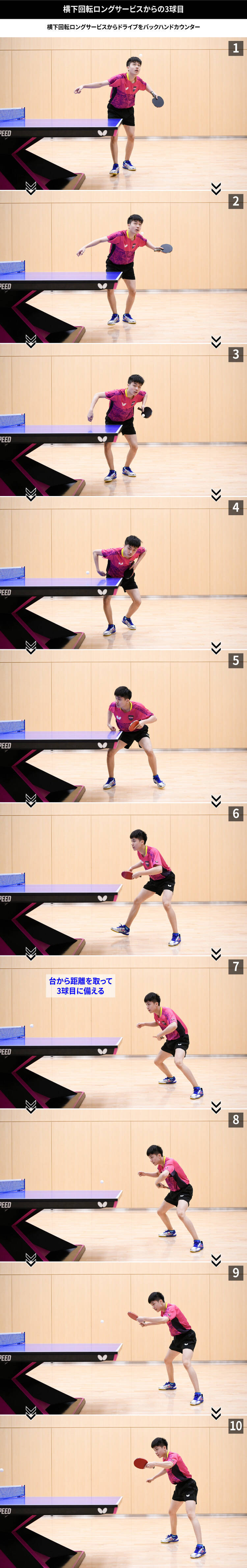 上の写真1~10は、横下回転ロングサービスをクロスに出した後、相手がバック側につないできたドライブに対して、バックハンドでカウンタードライブしている連続写真だ。ロングサービスを出した後のセオリー通り、サービスを出した後、相手のスピードのあるレシーブ(ドライブ)に備えて台から距離を取っているところを参考にしてほしい(写真5~7)。このほか、横下回転ロングサービスからは、バックハンドだけでなく、回り込んでフォアハンドでカウンタードライブするパターンも林昀儒は得意とする。