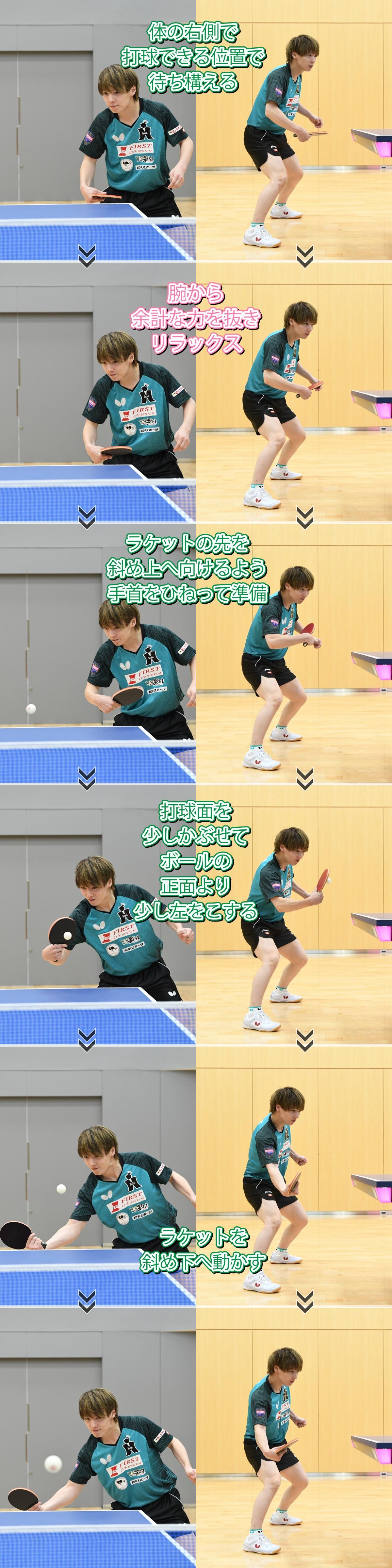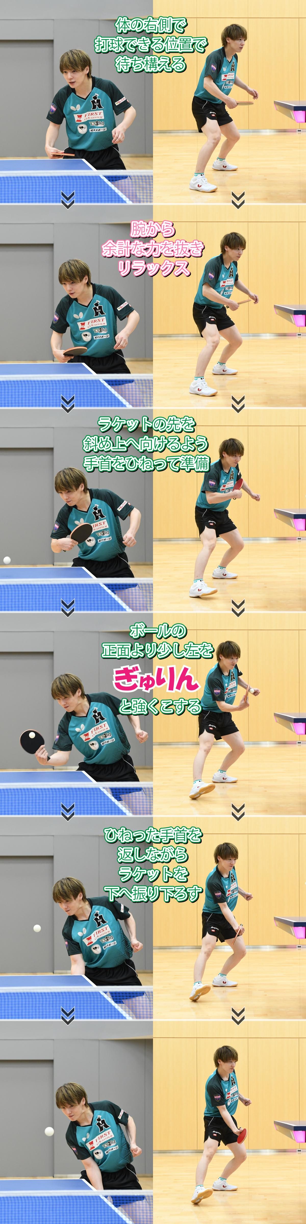 左横下回転をかけるときよりも打球面をややかぶせることがコツです。