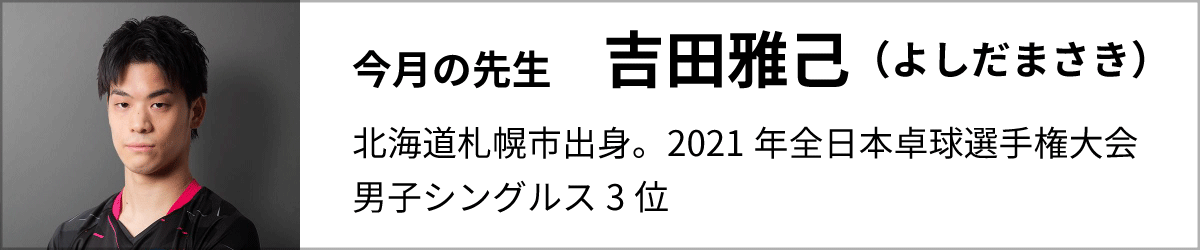 記念すべき第1回は、技術力の高さに定評のある吉田雅己選手が、ツッツキの効果を高めるちょい足しポイントを紹介してくれます。
