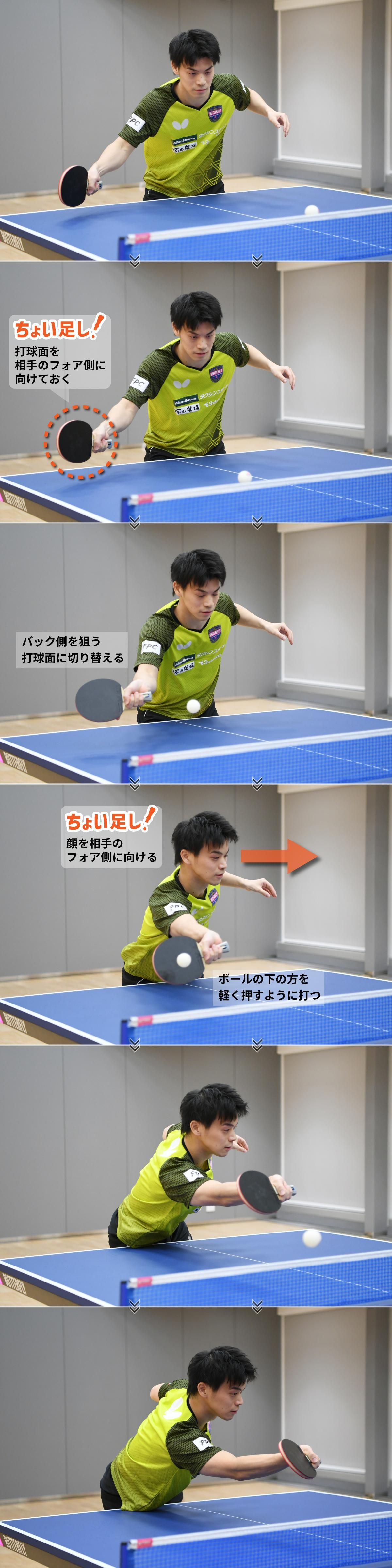 加えて、『打球時に顔を少しフォア側に向けるように動かす』と、さらに相手の判断を乱すことができるでしょう」