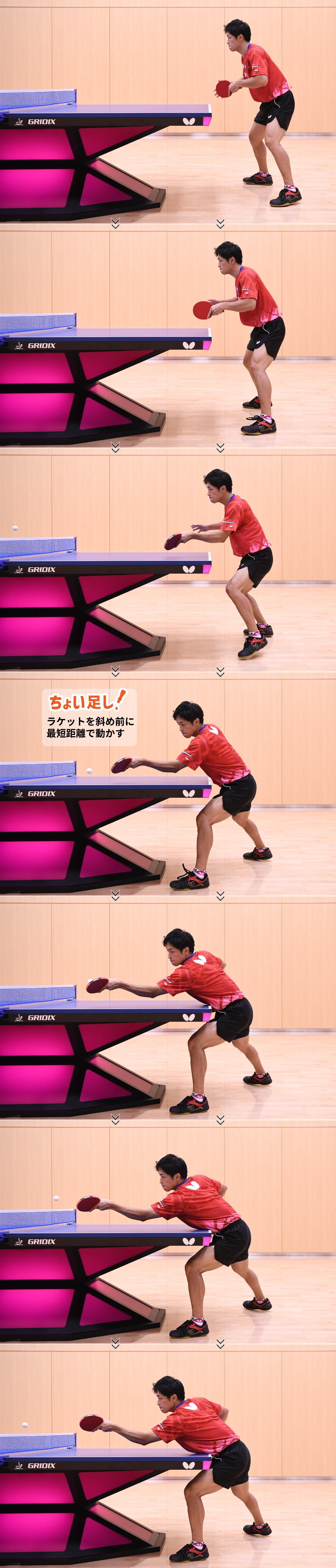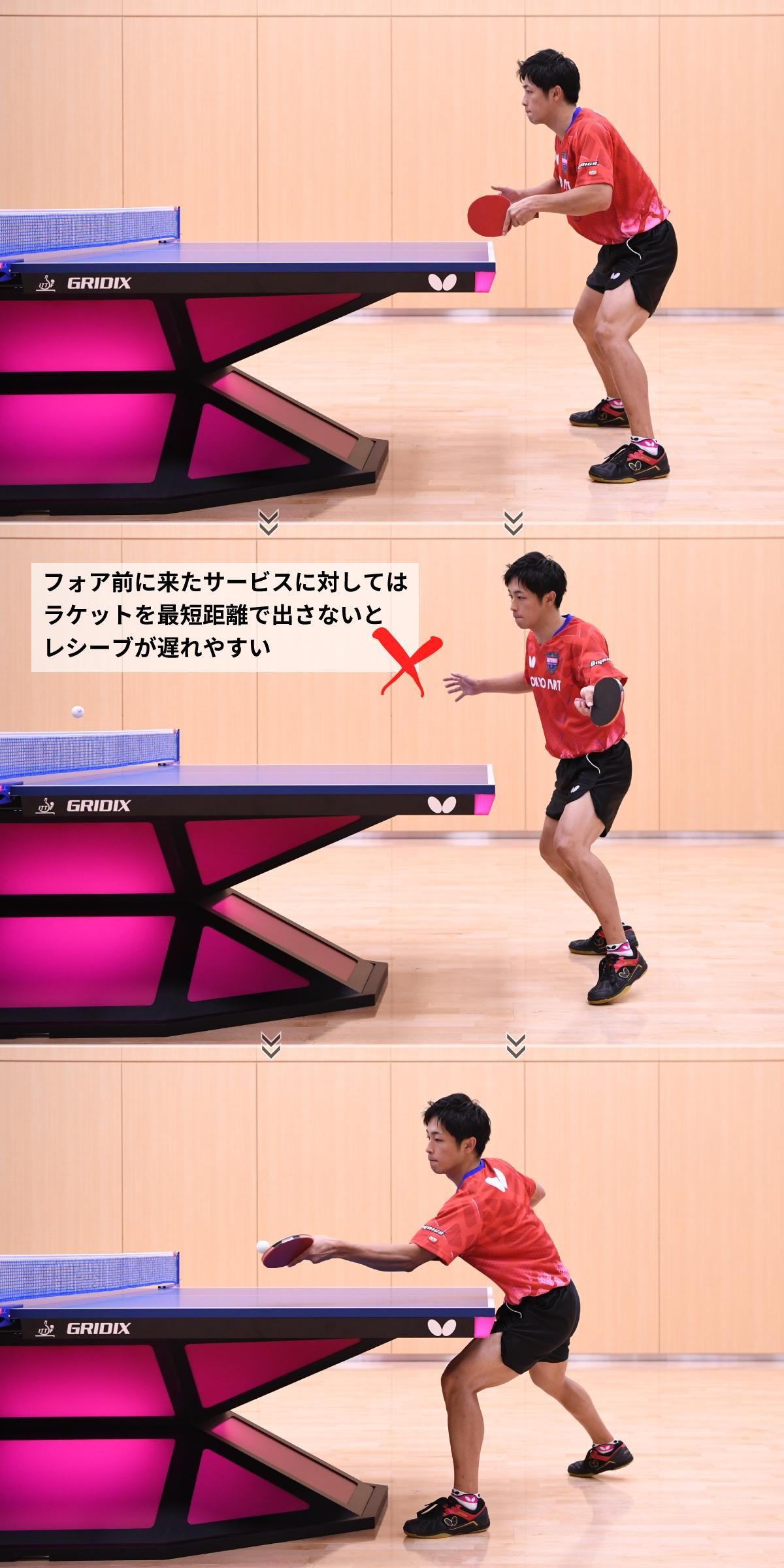 フォア前に来たサービスに対してレシーブが遅れやすいという選手は、ぜひラケットを最短距離で動かすことを意識してフォア前に動いてみてください」
