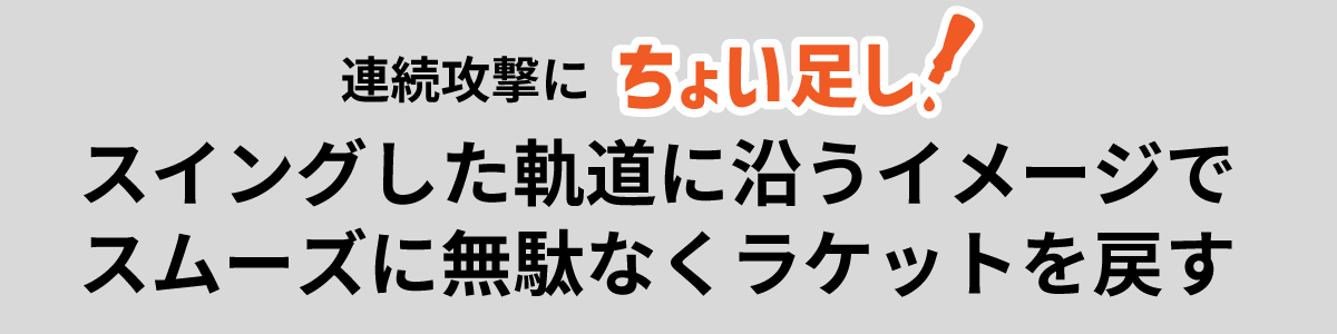そして、スムーズに戻るためのちょい足しポイントが『スイングした軌道に沿うイメージでラケットを戻す』ことです。そうすると、スムーズに無駄なく戻ることができるので、次の打球動作にもスムーズに無駄なく移ることができます。その結果、連続攻撃の成功率が高まるでしょう。