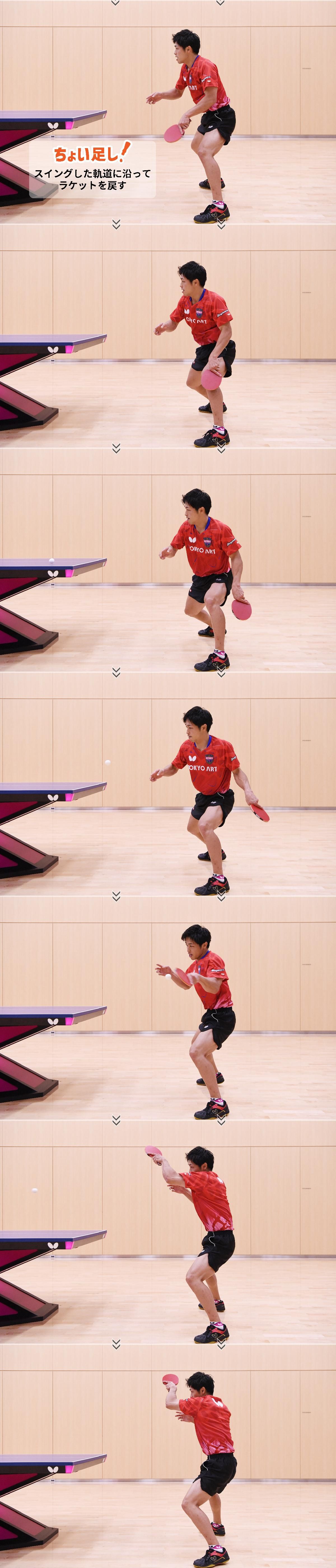トップ選手たちは総じて精度の高い連続攻撃を見せますが、それは、このちょい足しポイントを実践していることが理由の1つです。例えば、張本智和選手(木下グループ)はバックハンドの連打が素晴らしいですが、あの連続攻撃の安定感は、スイングした軌道と同じようなラインでラケットを戻しているからこそだと思います。