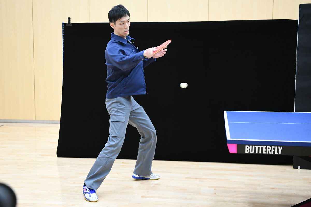 選手は、送球者がセンターライン付近に送球したロングボールをフォアハンドドライブで打球。その様子をバタフライの研究開発部スタッフがハイスピードカメラで撮影し、打球のスピード(速度)とスピン(回転数)を計測。スピードとスピン、それぞれのエネルギーを加味したトータルのエネルギーを「威力指数」として算出し、その数値の高さを競う