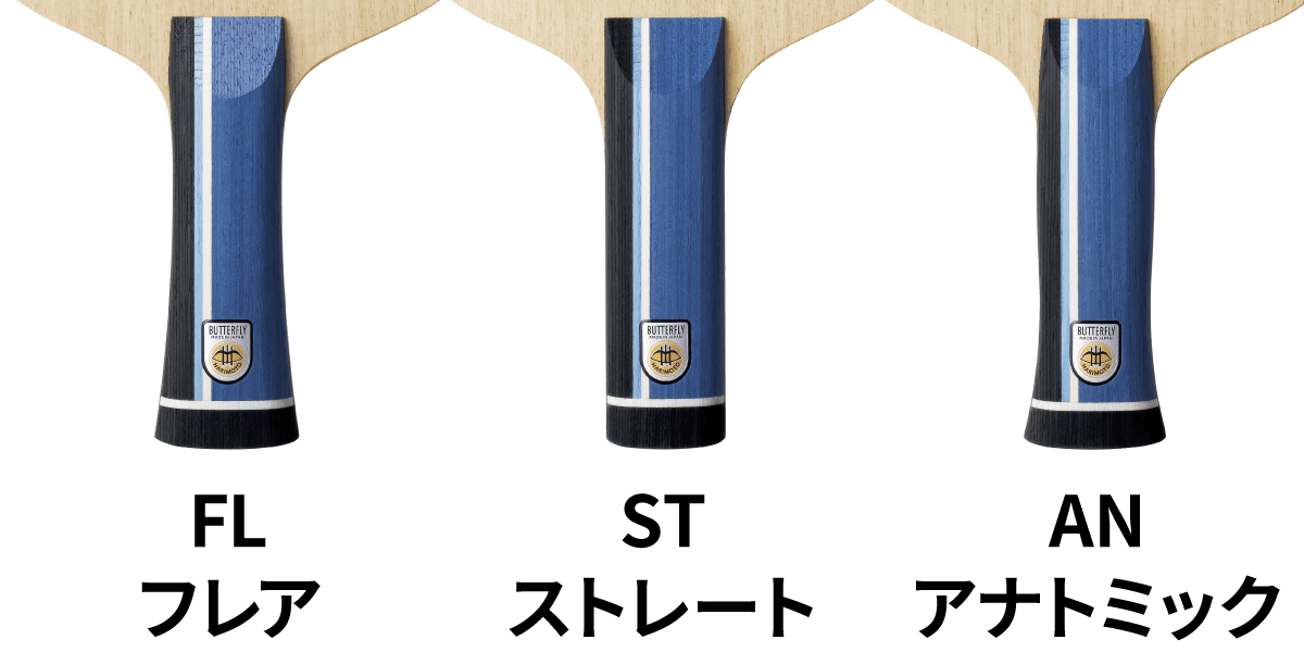 ラケットの柄の部分(手で握る部分)を「グリップ」と呼び、シェークハンドラケットのグリップには主として3つのタイプがあります。ここでは、3つのグリップ形状と、その特徴を紹介します。