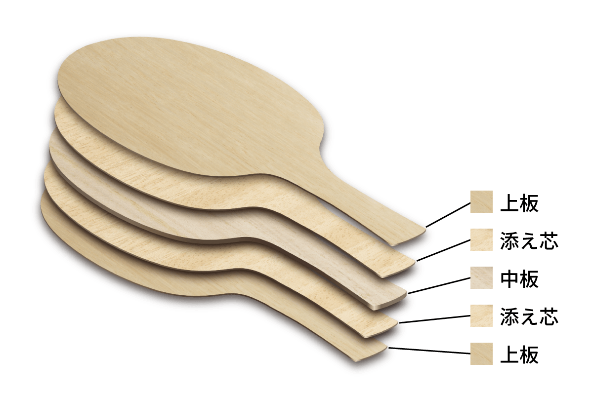 ラケットは主に板(木材)でつくられており、その構成パターンは大きく3つです。板の構成パターンによってそれぞれ特徴があり、その特徴を知ることは自分に合うラケットを選ぶ上で欠かせません。