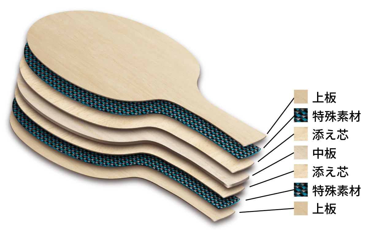 合板の性能を向上させる目的で、板と板の間に「カーボン」や「ZLファイバー」などの特殊素材の繊維を編んだシートを搭載したラケット。使われる特殊素材によって「反発力が高い」「球持ちがよい」など性能が異なる。トップ選手の多くが愛用。上のイラストは5枚合板に特殊素材を2枚使用したもの