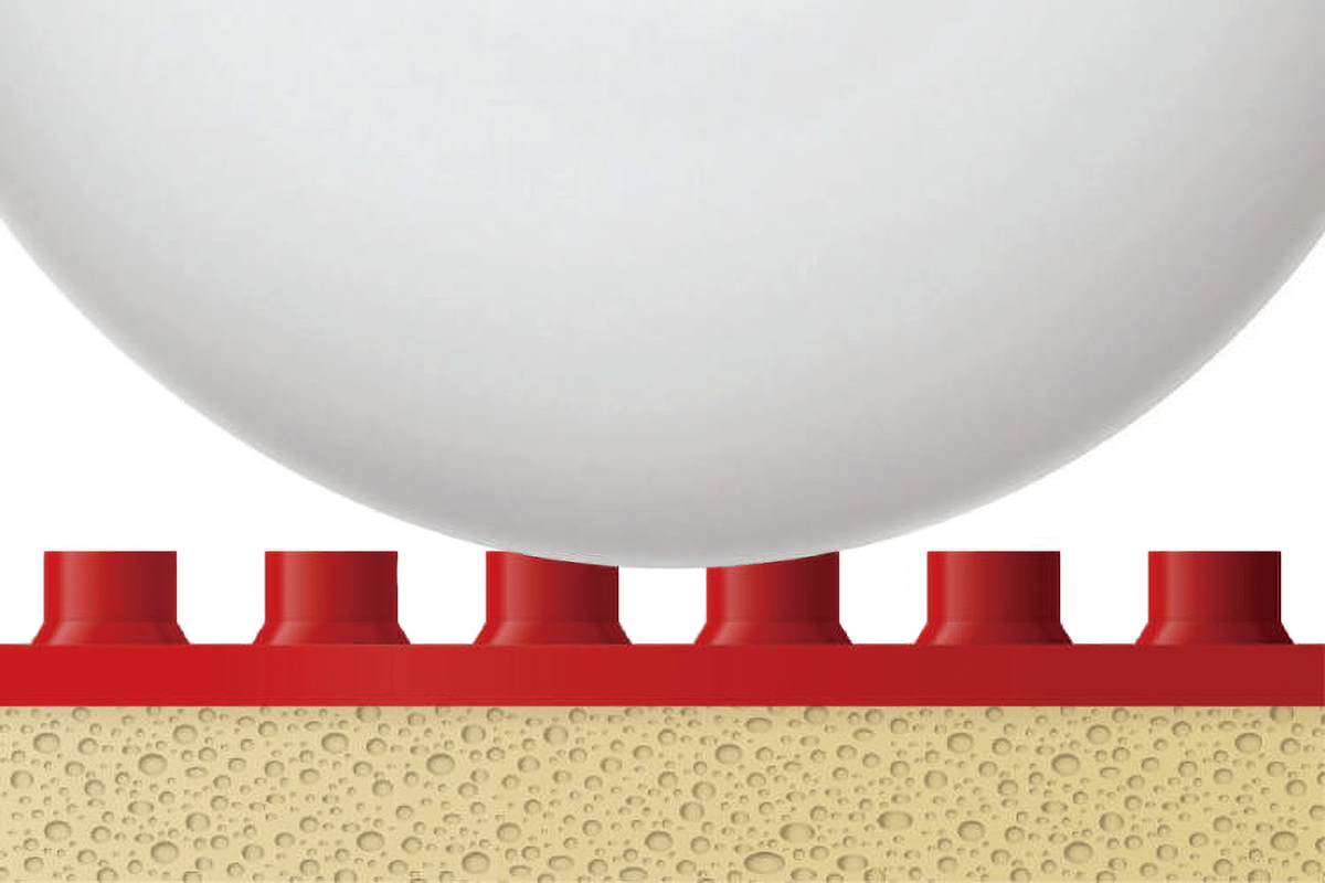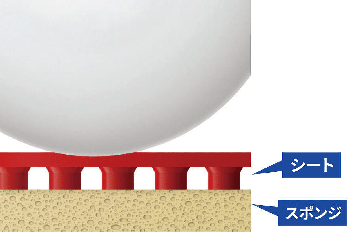 ラバーは「シート」と「スポンジ」でつくられていて、裏ソフトラバーはシートの表面(打球する面)が平らになっています。シートとスポンジの特性や組み合わせによって特徴が変わってきますが、総じて回転をかけやすく、コントロールしやすいラバーです。