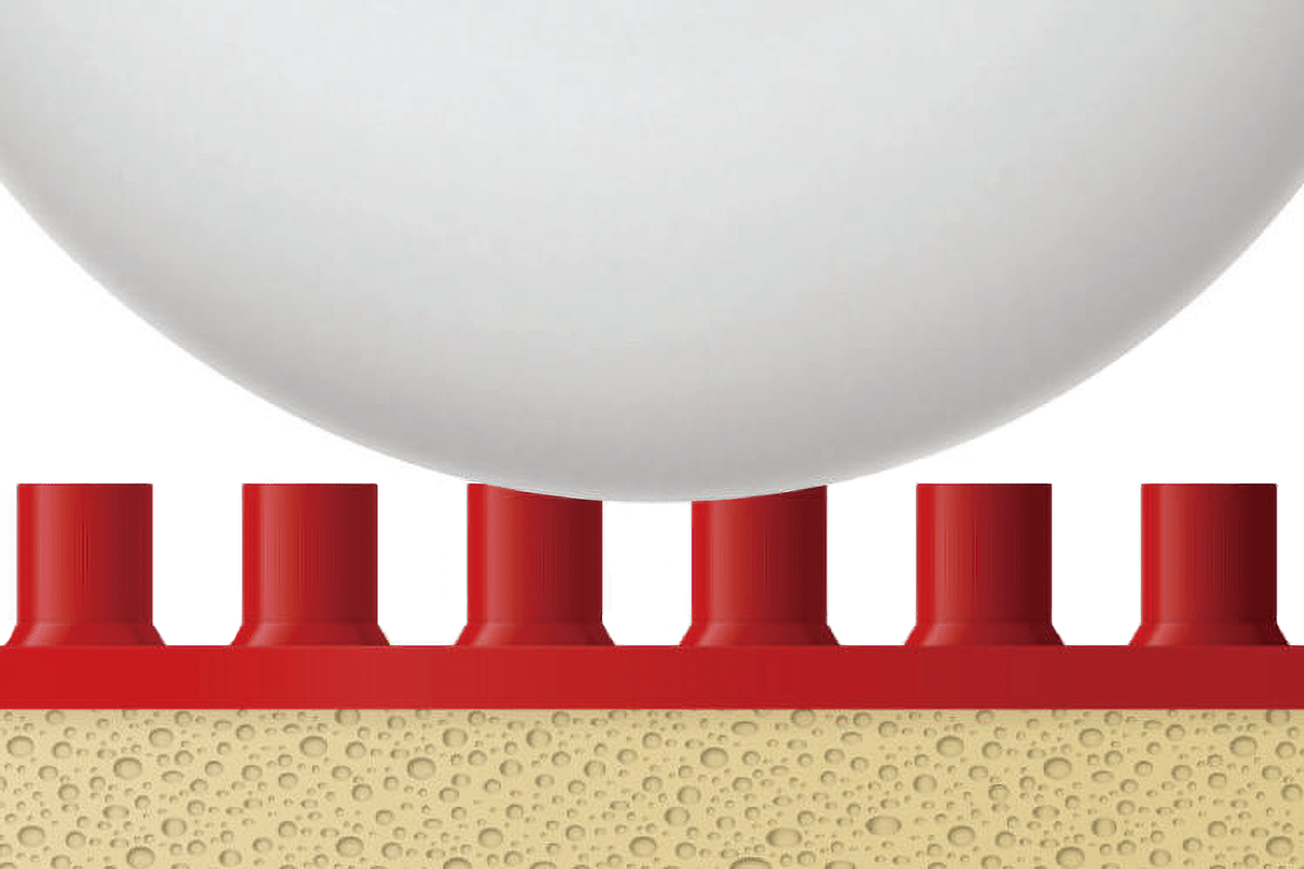 ツブ高ラバーは、表ソフトラバーよりもラバー表面のツブが細長いのが特徴です。ボールを打ったときに、ラバー表面の細長いツブが変形することで、さまざまな変化ボールを出すことができます。主に、シェークハンドラケットや反転用ペンホルダーラケットの片面にツブ高ラバーを貼り、もう片面に裏ソフトラバーを貼って、両面のラバーによる球質の違いを生かしてプレーします。