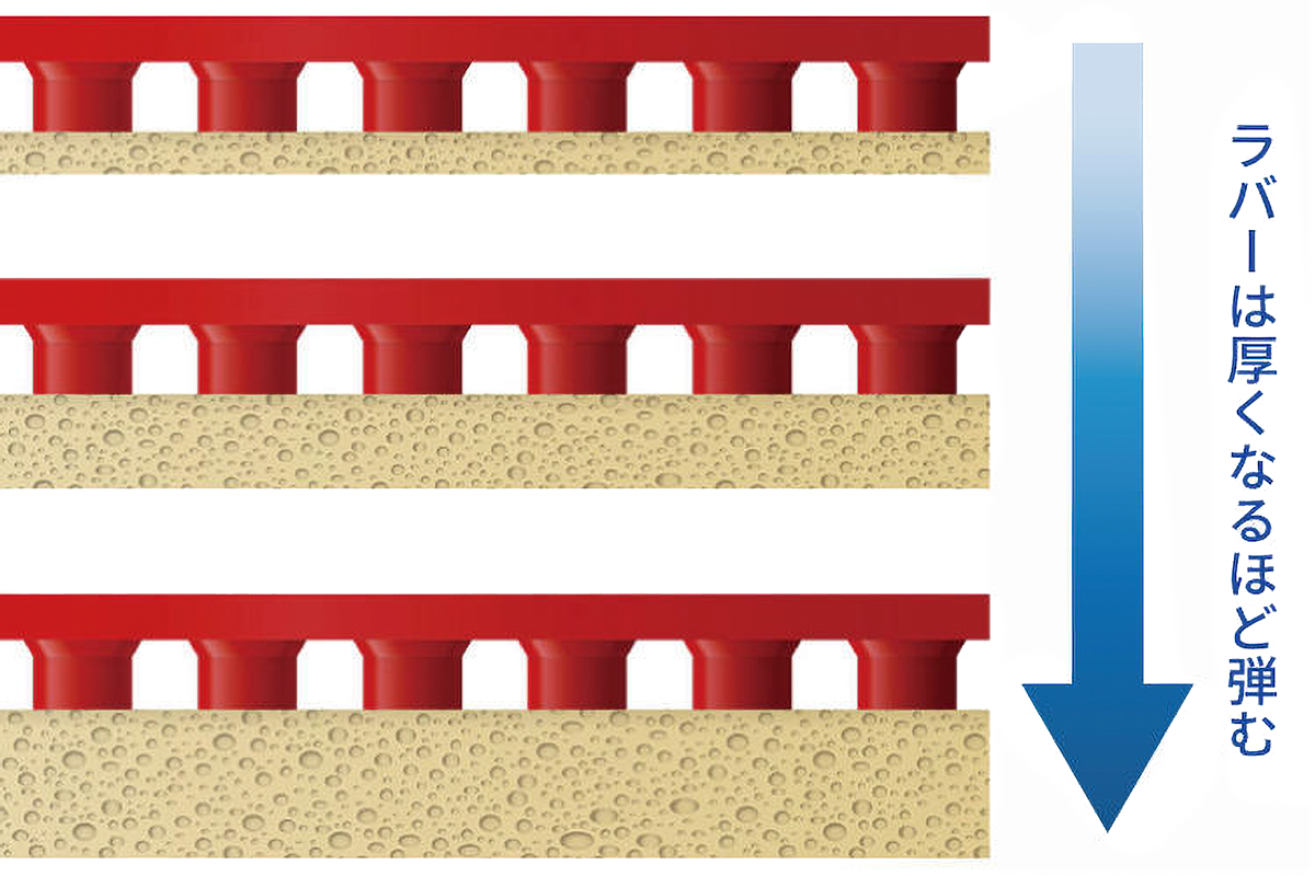 同じ種類(商品)の中で比べた場合、ラバーは厚いほどよく弾みます。また、ラバーは厚くなるほど相手の打球の回転の影響を受けにくくなります。ただし、ラバーは厚くなるほど重くなります。