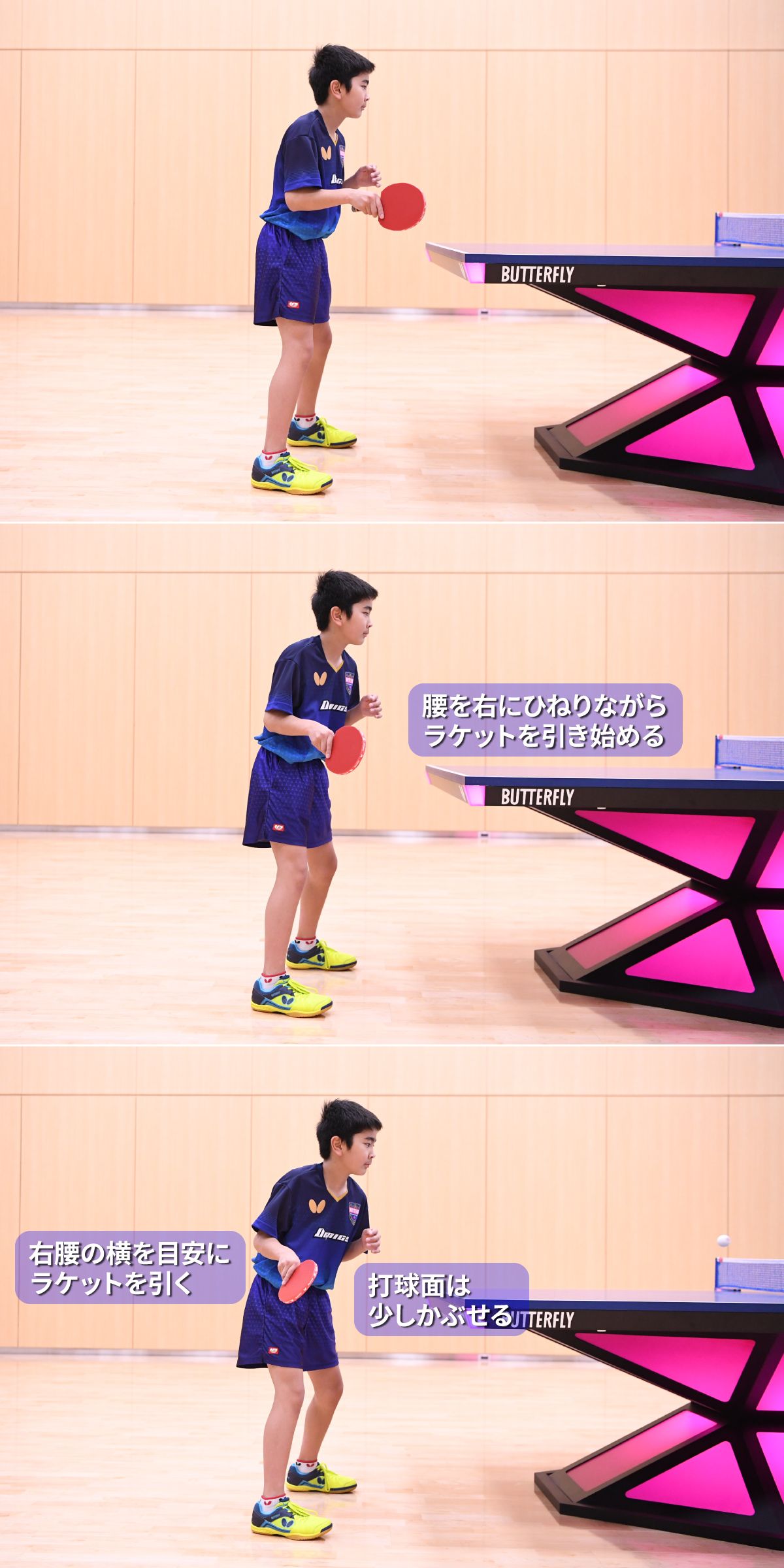 腰を右にひねってコンパクトにバックスイングしたら、ラケットを斜め上に小さく振り出して打球します。