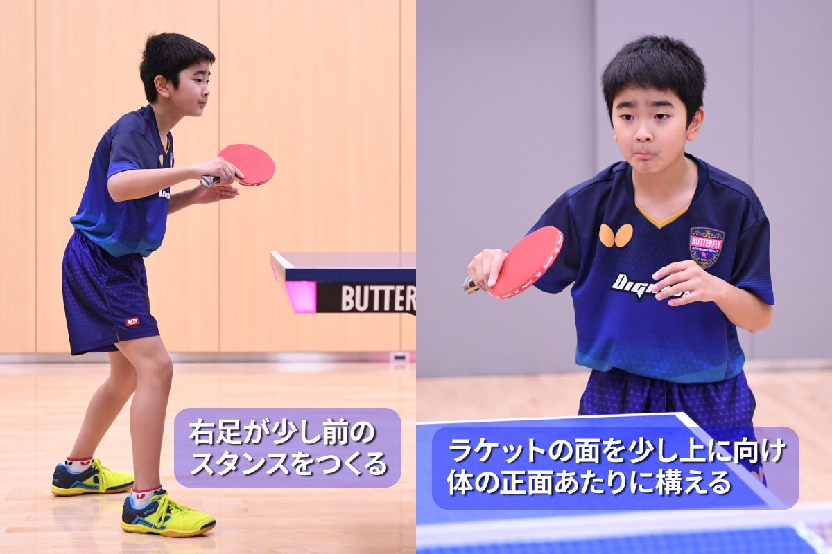 バック側に短く来た下回転のボールに対してバックハンドでツッツキするときは、右足が左足よりも少し前のスタンス(足の構え)にします。このスタンスで構えると、短いボールに体を近づけやすくなります。