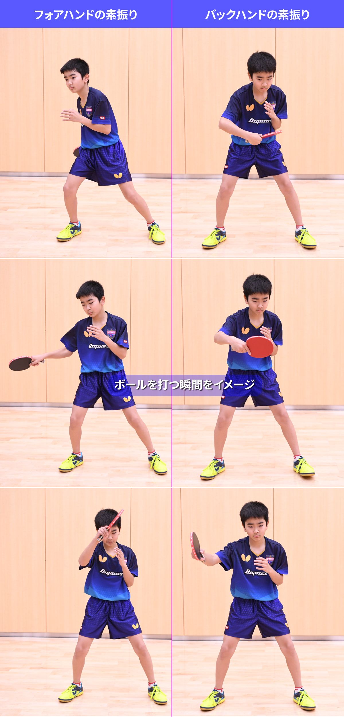 これまで紹介してきた基本技術を身につけるために、ぜひ行ってほしいのが、ボールを使わずにスイングする「素振り」です。素振りはフォームの確認や改善にとても有効な練習方法です。ラケットを振るスペースさえあればどこでも行うことができ、練習相手も必要ありません。