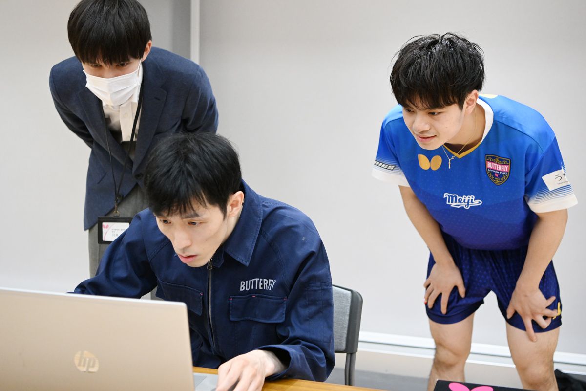 選手は、送球者がセンターライン付近に送球したロングボールをフォアハンドドライブで打球。その様子をバタフライの研究開発部スタッフがハイスピードカメラで撮影し、打球のスピード(速度)とスピン(回転数)を計測。スピードとスピン、それぞれのエネルギーを加味したトータルのエネルギーを「威力指数」として算出し、その数値の高さを競う