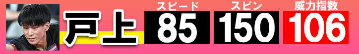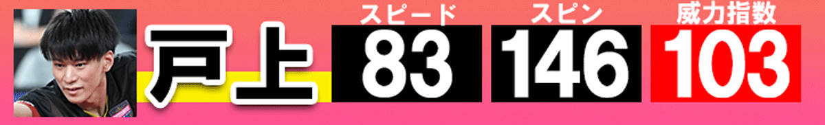 築地 お待たせしました、結果が出ました。戸上選手の速度が83キロ、回転数が146回転、威力指数が103です。