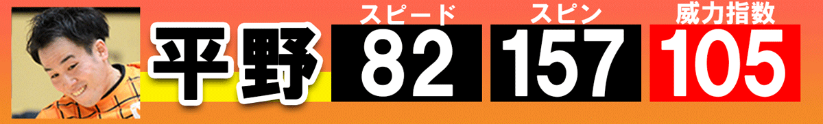 築地 出ました。平野選手の記録は、速度が82キロ、回転数157回転、威力指数が105です。