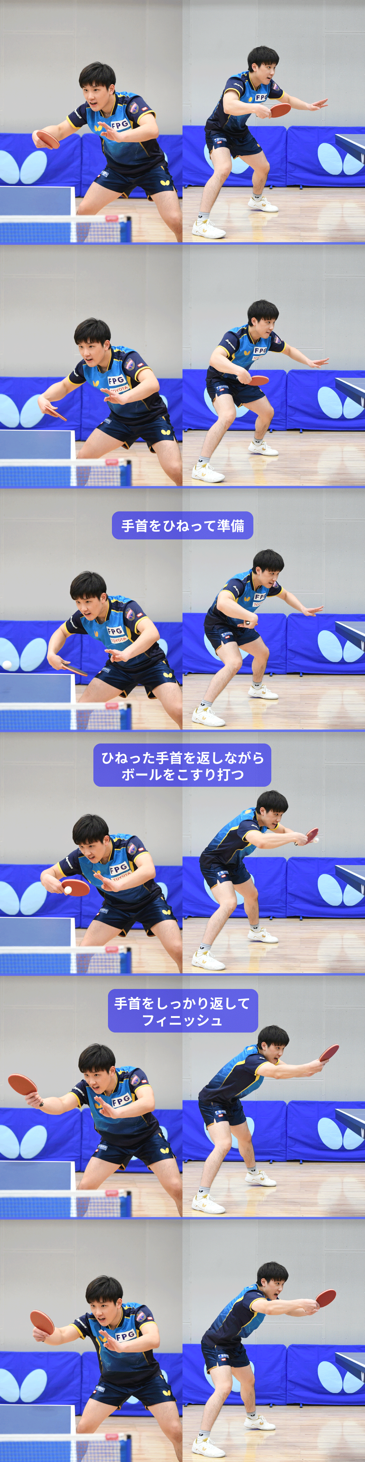 フォアハンドとは真逆ですね。フォアハンドは体を全体的に使いますが、バックハンドに限っては、ストップにしてもチキータにしても前陣でも下がっても、意識しているのは手首だけです。