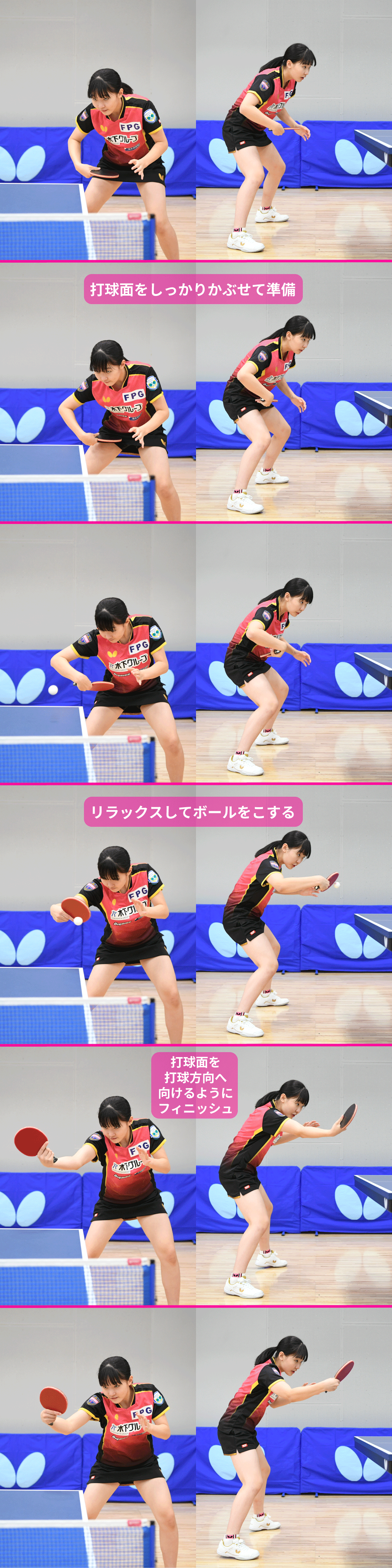 スタンス(足の構え)にも注目してほしい。二人の連続写真を見比べると、美和は、智和と比べると平行に近いスタンスで打球していることが分かる。女子は男子よりもバック対バックのラリーが長く続く傾向があるため、よりバックハンドが振りやすいよう平行に近いスタンスにしているのだろう。このスタンスも、バックハンドの安定感をもっと高めたいと考えている選手に参考にしてほしいポイントだ。