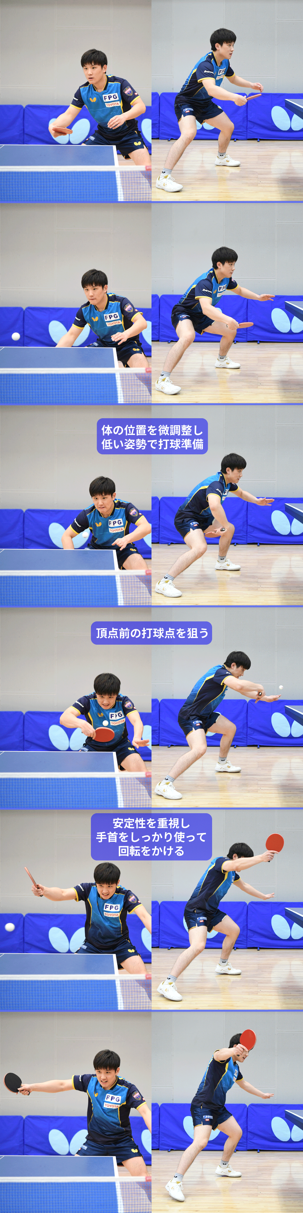 張本智和(以下、智和) やはり、手首を使うことです。上回転(ロングボール)に対するときと違うのは、もっと回転をかけないとボールが持ち上がりません。なので、上回転に対してよりも手首を使って回転をかけることを意識しています。