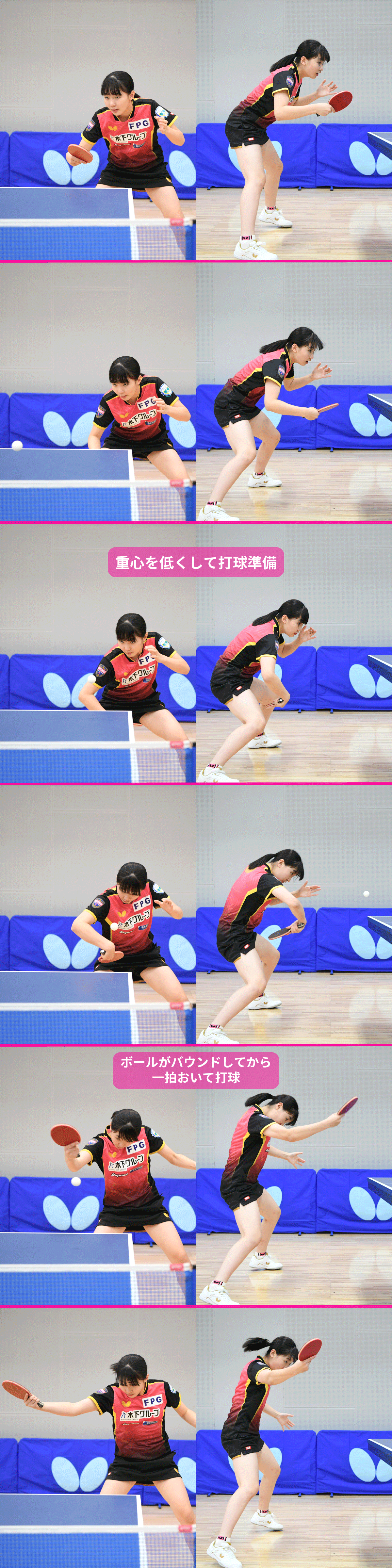 美和 そうですね。相手のツッツキが速くても遅くても、こちらのコートにバウンドしてから、一拍待ったくらいのタイミングです。