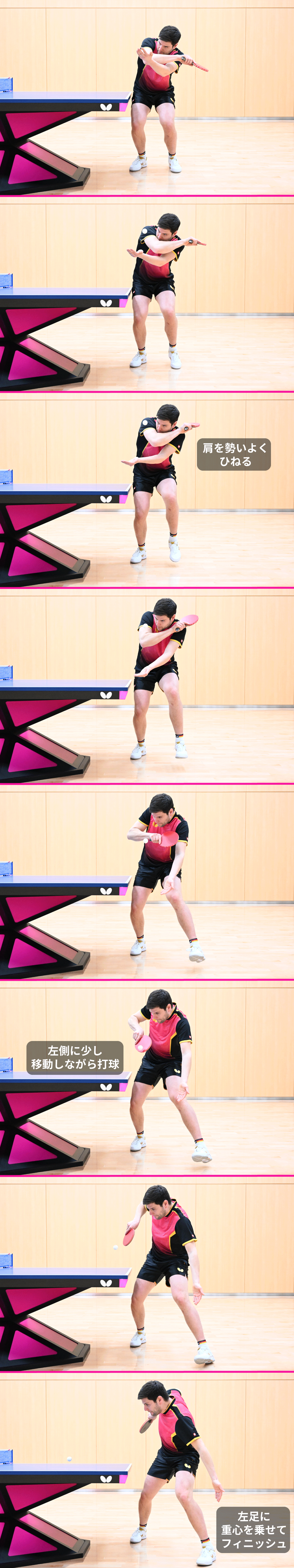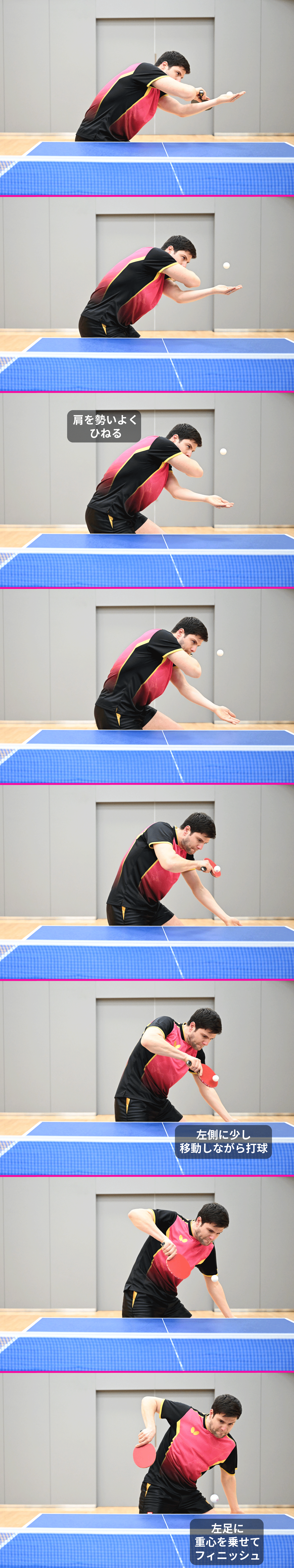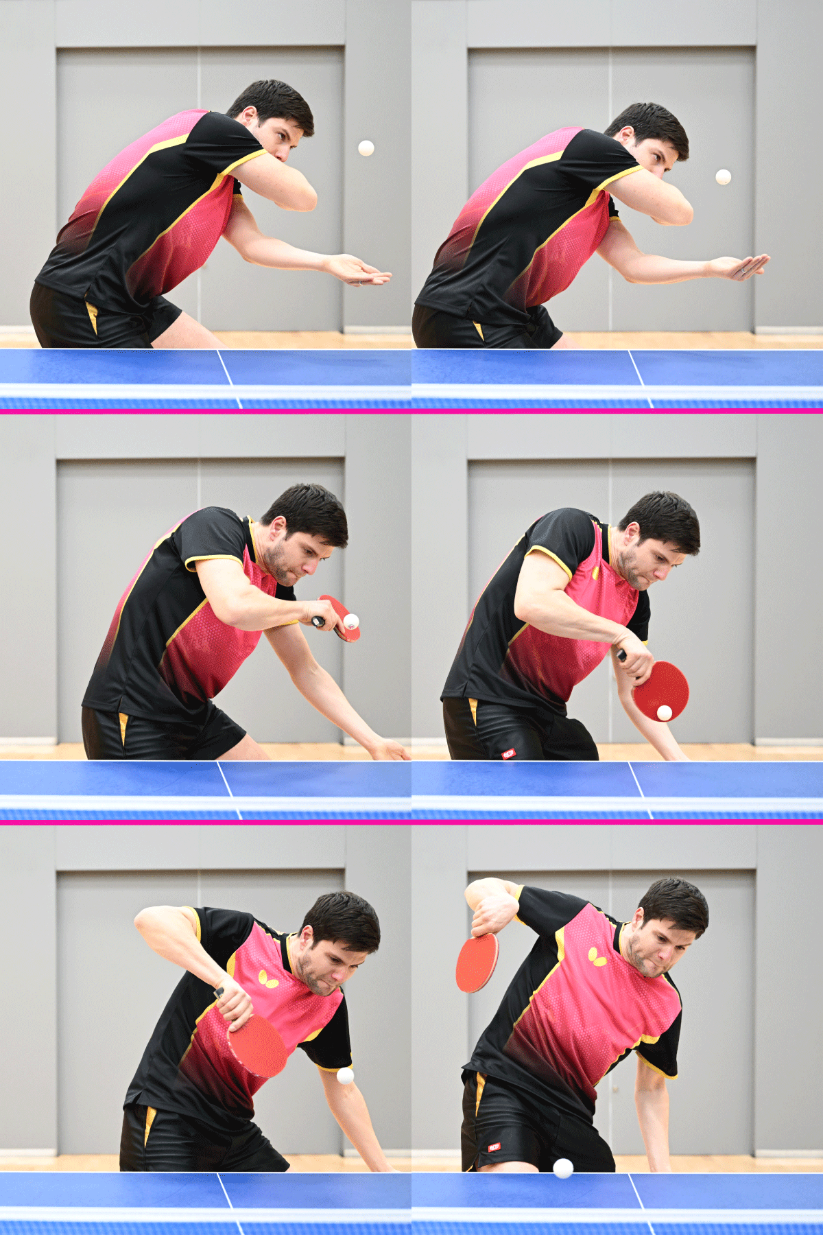 今回紹介しているサービスと、前回紹介した横回転ロングサービスの一連の動作を下に並べたが、双方の打球前の右腕やフリーハンド(左腕)の位置、前傾の角度などを見比べてもほとんど同じで見分けがつかない。この体勢から長短を自在にコントロールできるのはもちろんのこと、今回紹介してくれたように、相手がロングサービスを待つよう強めに誘導するテクニックもオフチャロフのバックハンドサービスの大きな強みだ。