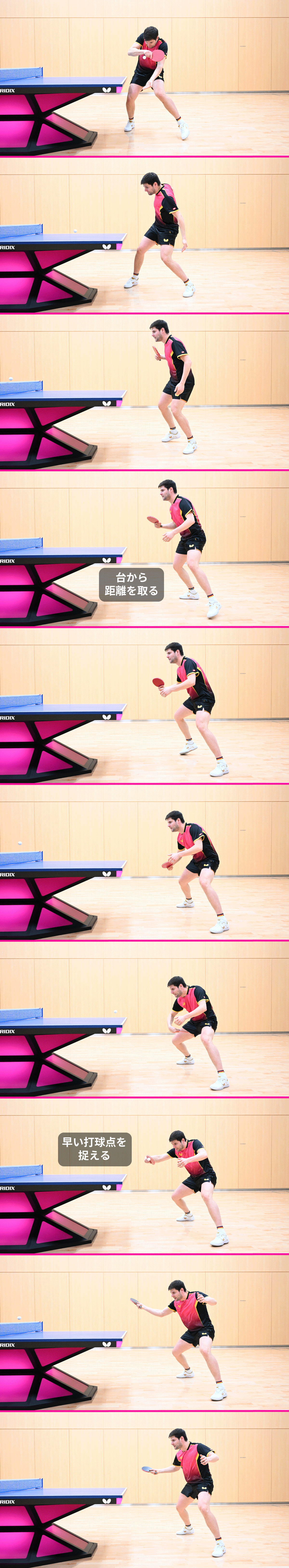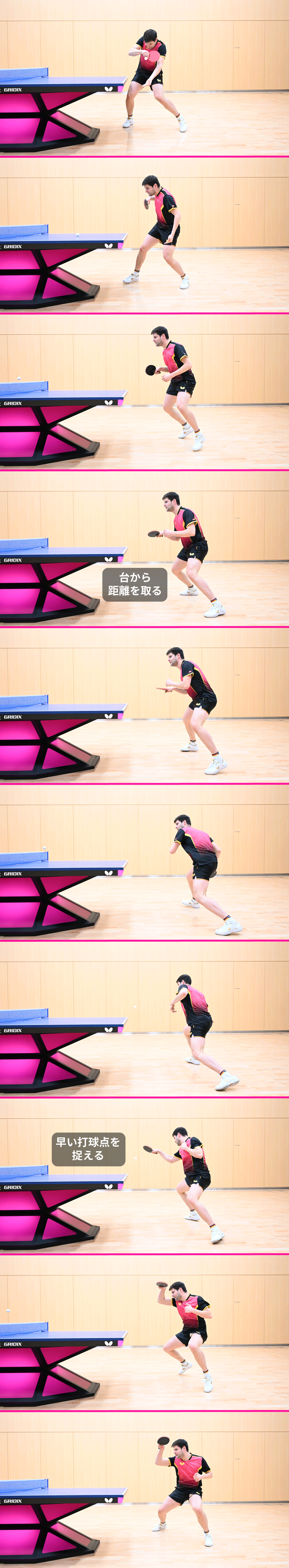 また、ミドルに来たフリックレシーブに対して、右足が左足よりも前のスタンス(足の構え)でバックハンドドライブしているところも注目だ。右足前のスタンスをつくるとバックハンドで打球するスペースが広く取れるので、ミドルに来たボールに対してスイングが窮屈になることなくスムーズにバックハンドドライブすることができる。