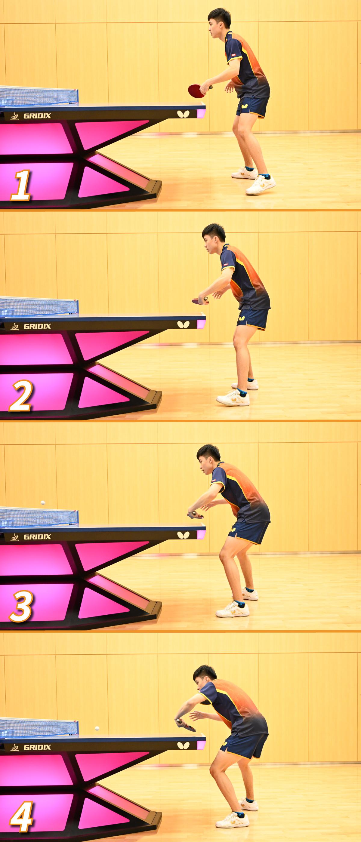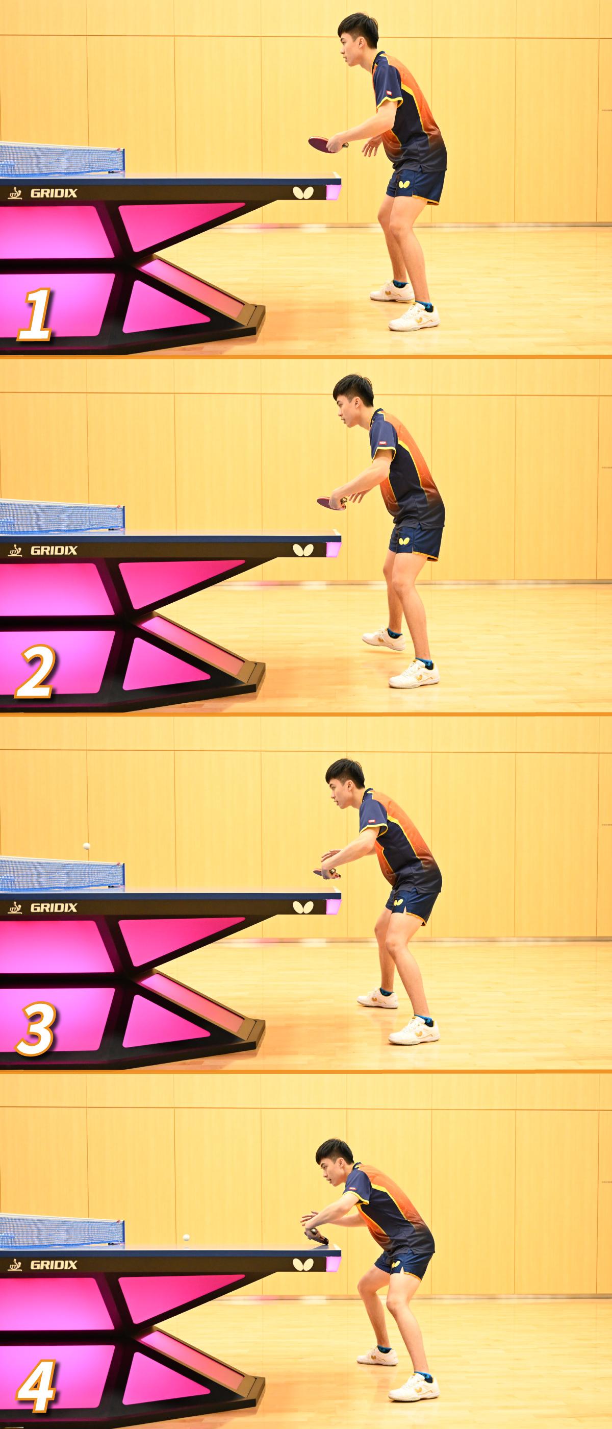 フォア前に来たサービスをチキータする場合は左足(右利きの選手は右足)を踏み込むことが基本だが、バック前に来たサービスをチキータする場合は、コースに応じて左右どちらかの足を踏み込むという林昀儒。
