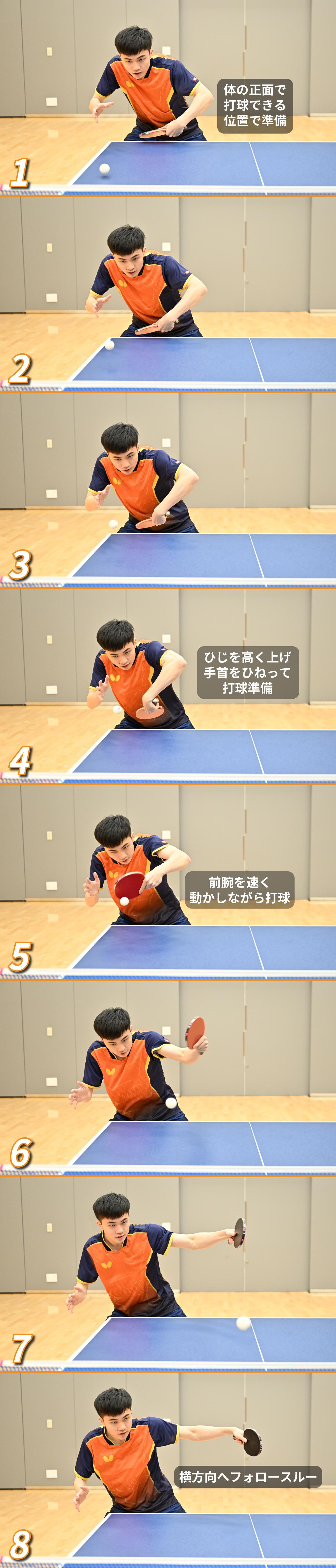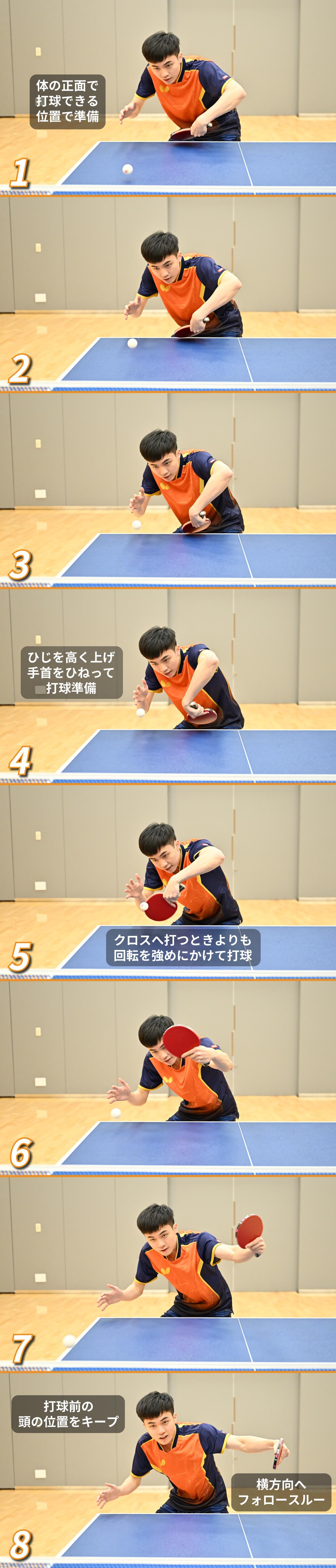 そのほかのポイントとしては連続写真の頭の位置に注目だ。林昀儒の頭の位置は打球準備から(写真1)打ち終わりまで(写真8)ほとんど変わっていないが、このように頭の位置が安定していると「目線が安定して目測が正確になる」「スイング時に力を入れやすい」などのメリットが生まれる。林昀儒のように鋭くて安定性の高いスピードチキータをマスターしたいと考えている選手は、スイング中の頭の位置を安定させることを意識してみよう。