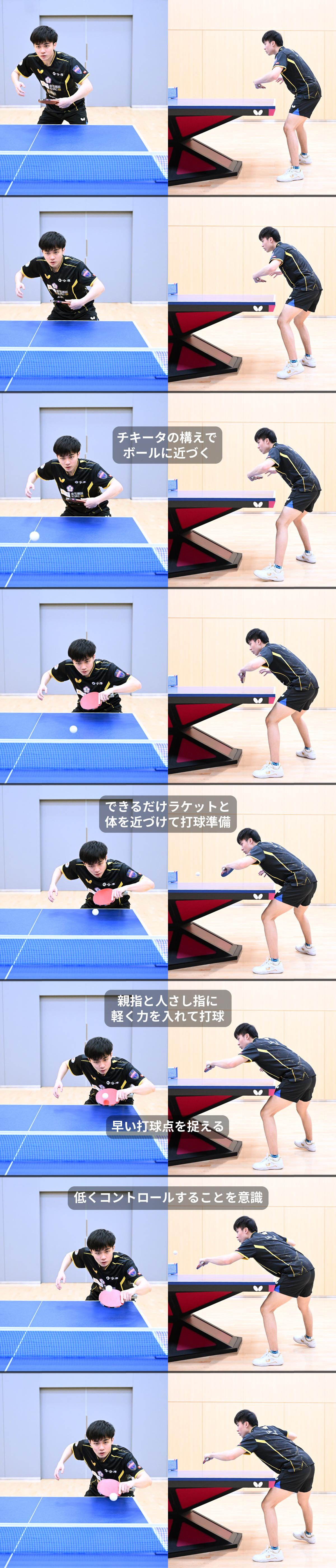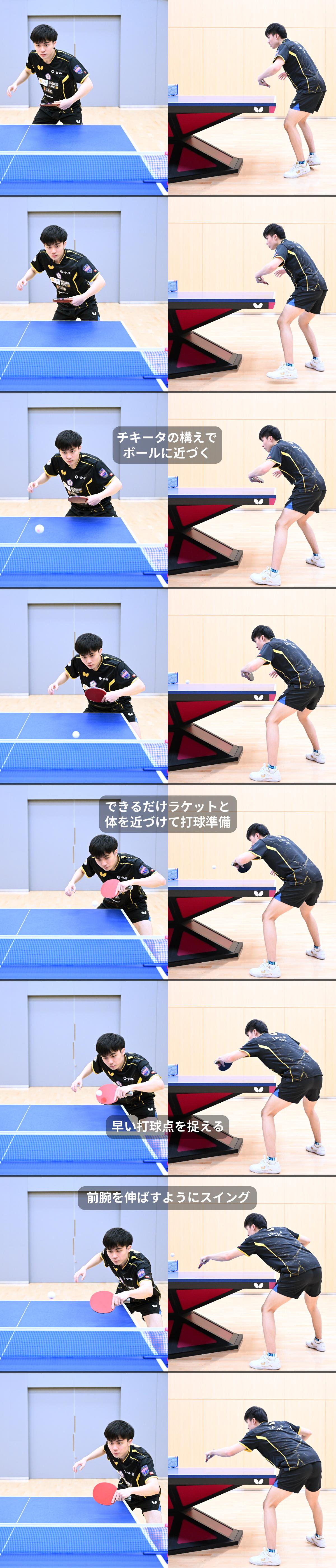 そのほか、「チキータが来る」と相手にプレッシャーをかけられるよう、チキータする構えでボールに近づいているところも参考にしたいポイントだ。